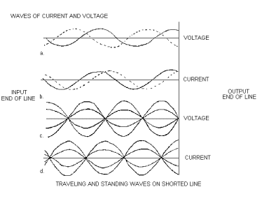 Going back to the first image, looking at the waveforms below the circuit we see that standing waves go from maximum to minimum in 1/4 wavelength intervals along the line. The open or short circuited line will present to it's source a high or low impedance at multiples of 1/4 wavelength, depending upon the location of the source in reference to the load (an effect you see when you alter coax lengths). At points that are not an exact 1/4 wavelength multiple from the load or antenna, the line acts as a capacitor or an inductor. Current at the generator will either lead or lag the voltage. An open or short circuited line may assume the characteristics of a resonant circuit formed of lumped component elements of inductance and capacitance.