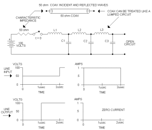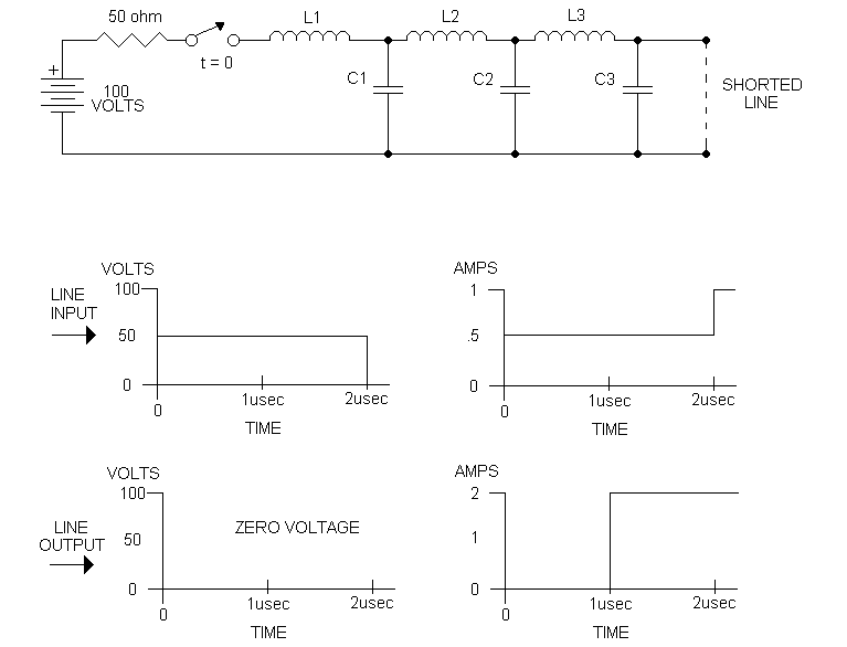 OPEN LINE: When the switch is closed at t=0, 1 amp will flow from the 100 volt source, since the 50 ohm resistor is in series with the 50 ohm impedance of the line, (the resistor is added so the applied voltage to the line will be 50 volts). As the capacitors begin to charge one by one, a voltage wave moves down the line, which we call the incident voltage wave. There is also an incident current wave which propagates with the incident voltage wave. In 1 usec when the incident waves reach the end of the line, and C3 is charged to 50 volts by the current through L3, and there is no more coax to charge so the magnetic field around L3 will collapse, and the collapsing field will keep the current flowing in C3 in the same direction, charging C3 to 100 volts. Since the current in L3 is now gone, the current in L2 collapses, and in the same way charges C2 to 100 volts as well. Likewise now L1's field collapse charges C1 to 100 volts, until the voltage all across the line is 100 volts, and current flow in the line is zero. The source at this time (t=2 microseconds) "sees" an open circuit for the line. The capacitors charging from 50 volts to 100 volts from the end of the line toward the source creates a reflected voltage wave traveling toward the source propagating in phase and in the opposite direction of the incident voltage wave. The inductors, discharging from the open circuit toward the source create a reflected current wave propagating out of phase and in the opposite direction of the incident current wave. In the drawing are shown the voltage and current verses time at both the input and output ends of the line.SHORTED LINE: The line charges in the same way as the previous circuit but since the voltage must equal zero in a short circuit, when the incident voltage and current waves reach the short circuit (in 1 usec), the charge on C2 must discharge into L3, producing a current of 2 amps in L3. When the voltage of C2 approaches zero, C1 discharges into L2, producing 2 amps of current in it. This goes on until the entire line is at zero volts. The reflected current wave in this case is in phase with the incident current wave, while the voltage reflection in this case is out of phase with the incident voltage wave. At t=2 usec, the source "sees" a shorted line.
