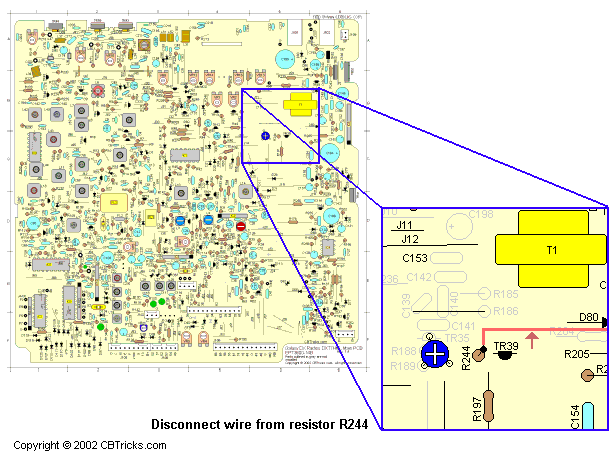 Talkback can become distorted if these radios have been "peaked," and there is no cure because the talkback just amplifies what goes to the RF section. Try adding a 470k ohm resistor from junction of C154/R207 to the junction of C187/R235 on the solder side of the board. This will also give you clean talkback on SSB and FM. Try different values of resistance to get the amount of volume you want. The less the resistance the louder the talkback will be. |