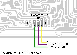 3. Using the provided screw, mount the Viagra "A" PCB through the open hole in the chassis, just behind the channel selector location. Use the hole which is closer to the center of the chassis. 4. Locate J4 on the main board. It is located near the front-right of the board as you are viewing it. Remove J4. 5. Locate J14 on the main board (EPT06960Z). 6. Route the Green, Purple and Yellow wires from J604 on the Viagra A board under the front of the EPT06960Z and to the underside J14 on the EPT06960Z board. 7. On the solder side of J14 on the main board, (a) solder the Green wire to the LSB pad, (b) solder the Purple wire to the USB pad (c) solder the Yellow wire to the AM pad.