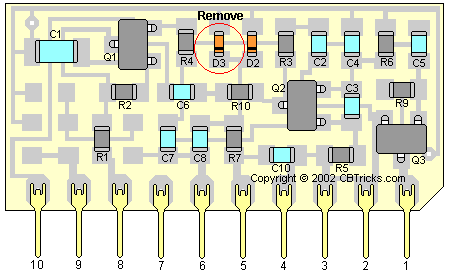 2. On the portion of the board facing the front of the radio, count over four (4) components on the top row. This is diode D3.