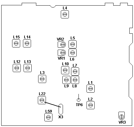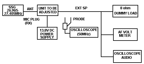 core of the L6 up to bottom. 3. Next, adjust in the same way L6 to reach its peak. Sensitivity deviation of 1 CH & 40CH at L6 is to be adjusted to obtain within 1 dB. Then, set Mode switch back to 30CH. 4. Set Mode switch to USB, shift SG to 1KHz high & switch "off" MOD. Adjust L12. L14, to reach its peak while adjusting SG output for AF output to obtain 2V. 5. After changing back SG TO 30CH, 1KHz, 30% MOD & unit back to 30CH, rotate SQ fully CW. Set SG 63dB & adjust VR3 for just open squelch. After completing this adjustment, return SO to fully CCW location. 6. Set SG output to 46dB NO MOD at this time. Adjust VR1 to reach "S - 9" which will be displayed from the S-meter. (Adjust S-meter & TX-meter together). 7. Next set Mode switch to "USB" & AF output is to place SG output to 46dB. Adjust VR2 to reach "S-9" as to be shown by S-meter. 8. Set unit at 18CH with SG at 19CH (10KHz high freq.) & set NB ANL switch to NB/ANL. Fix oscilloscope to DC range, connect Probe to TP6 & adjust L1, L2 to obtain max voltage At this time, reduce SG output by the continuous conditions of adjustment & adjust L1. L2, to its peak. At an output level of 10dB. When adjusting, set Mode switch to "LSB". 9. Check all channels of AM, USB, ANL NOISE BLANKER & other such items based on the specifications. 10. Check if any signal tones can be heard from PA SP at PA mode. 11. Operate on PTT according to (10) conditions. Put PA to normal & check if RX-LED was turned "OFF".